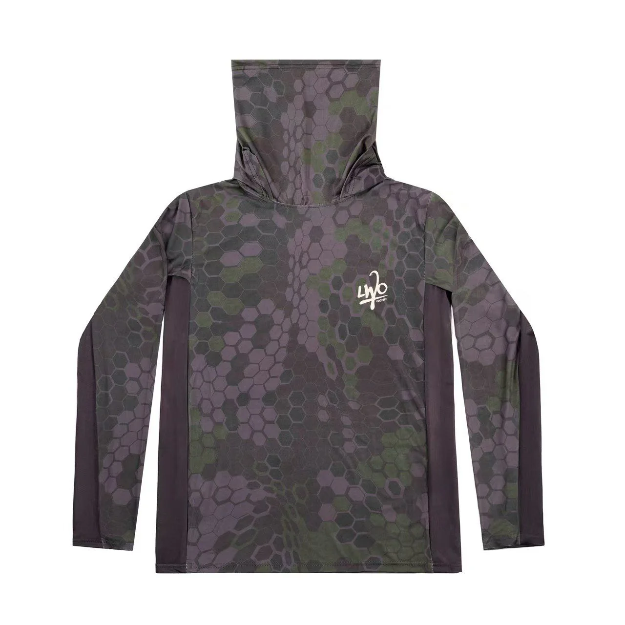 Relaxed fit, Lightweight Fishing long sleeve shirt with a Hood, integrated gaiter and all over print