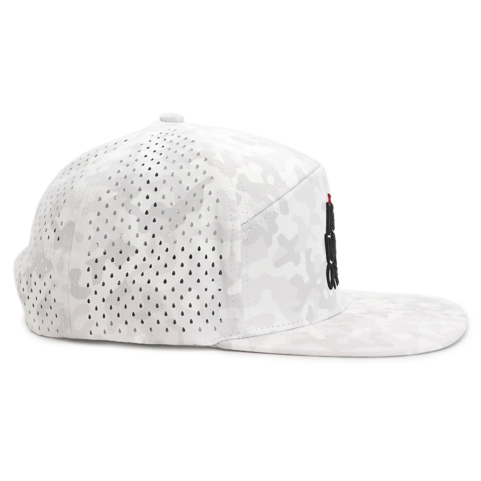 We brought our best selling hat to a flat brim with this super comfortable white camo, 6 panel, flat brim snapback rocking a black and red 3D Life Wide Open embroidery.